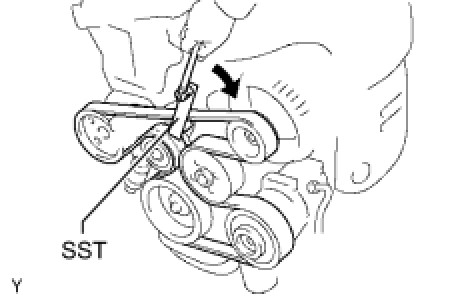 (a) Using SST, loosen the V-ribbed belt tensioner arm clockwise, then install the fan and generator V belt.