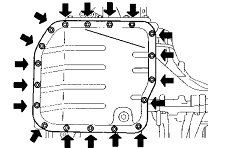 (c) Install a new gasket and the oil pan to the transaxle case with the 18 bolts.