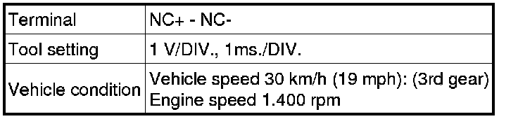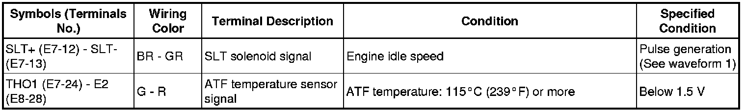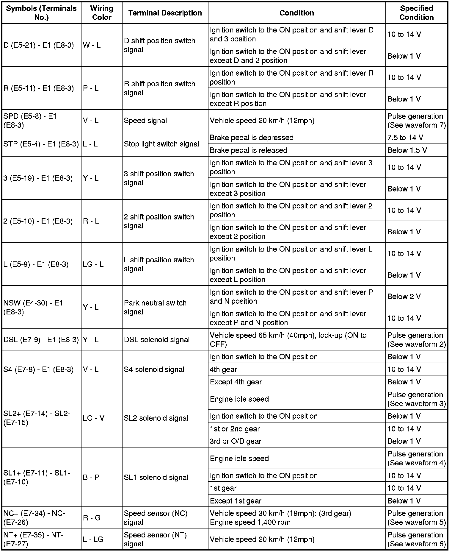 In the table, first follow the information under "Condition". Look under "Symbols (Terminal No.)" for the terminals to inspected. The standard voltage between the terminals is shown under "Specific Condition".