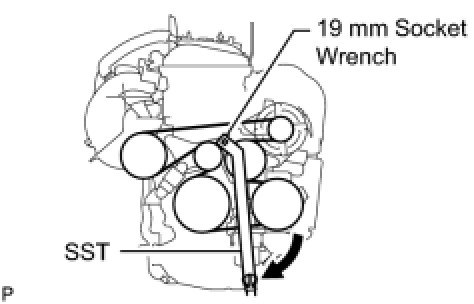 (a) Using SST and 19 mm socket wrench, loosen the V-ribbed belt tensioner arm clockwise, then install the fan and generator V belt.