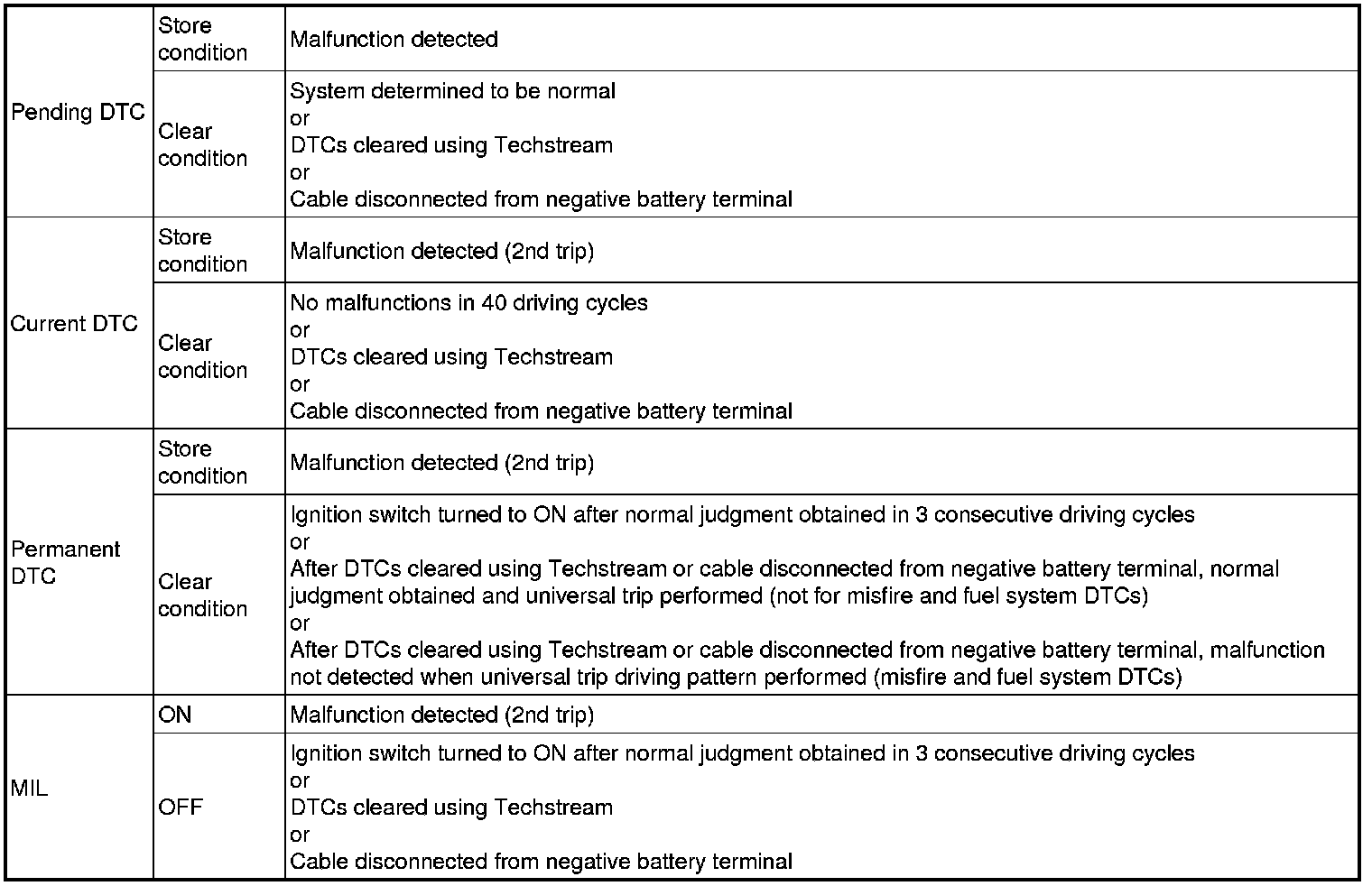 * Current and pending DTCs can be cleared by using the Techstream or by disconnecting the cable from the negative battery terminal. However, permanent DTCs cannot be cleared using either of these two methods.
