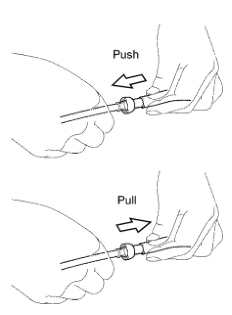 (2) Match the axis of the connector with the axis of the pipe, and push into the connector until the connector makes a "click" sound. If the connection is tight, apply a small amount of clean engine oil to the tip of the pipe.