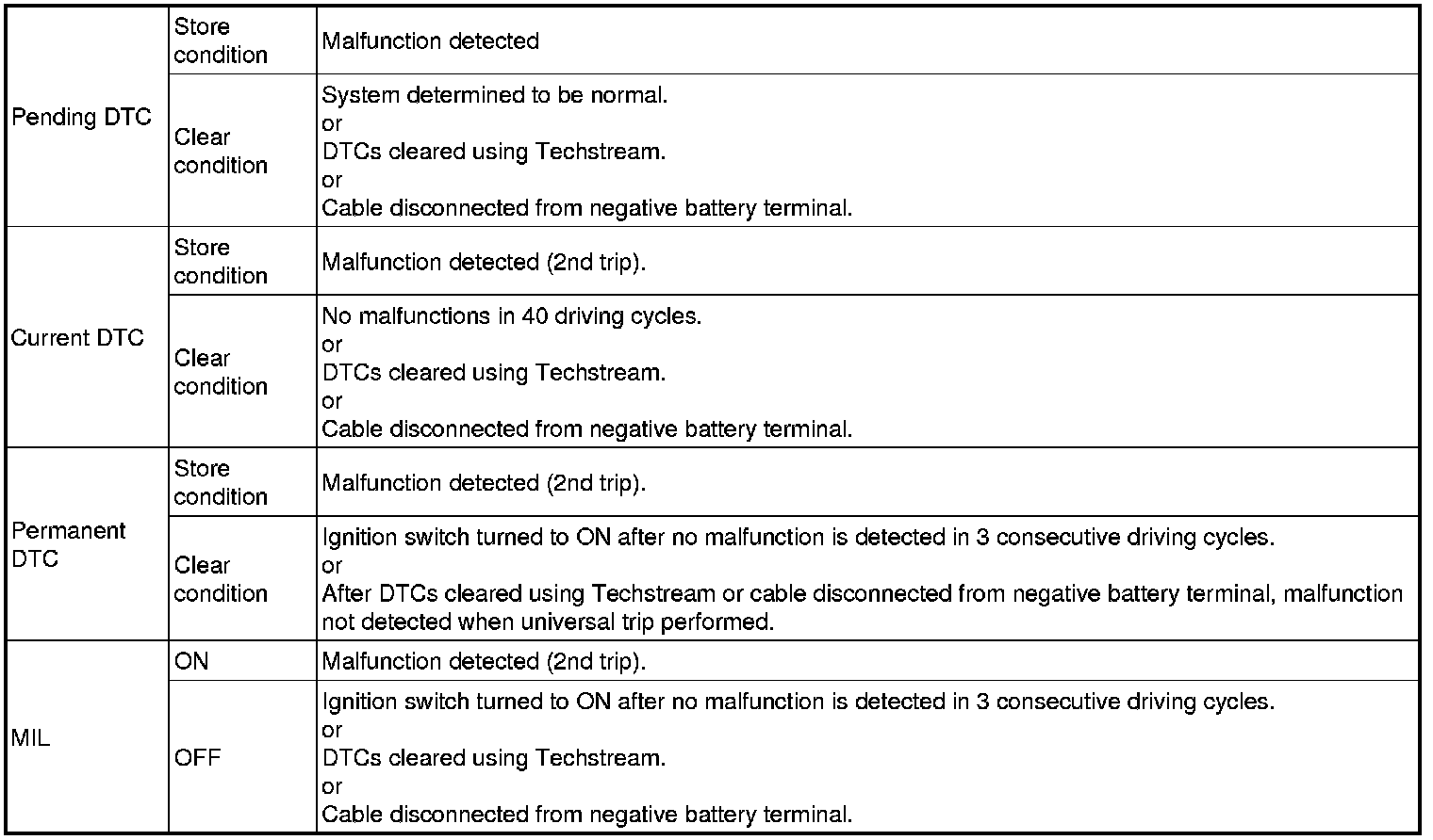 * Some DTCs are not stored if the ECM does not detect the same malfunction again during a second consecutive driving cycle. However, such malfunctions, detected on only one occasion, are stored as pending DTCs.