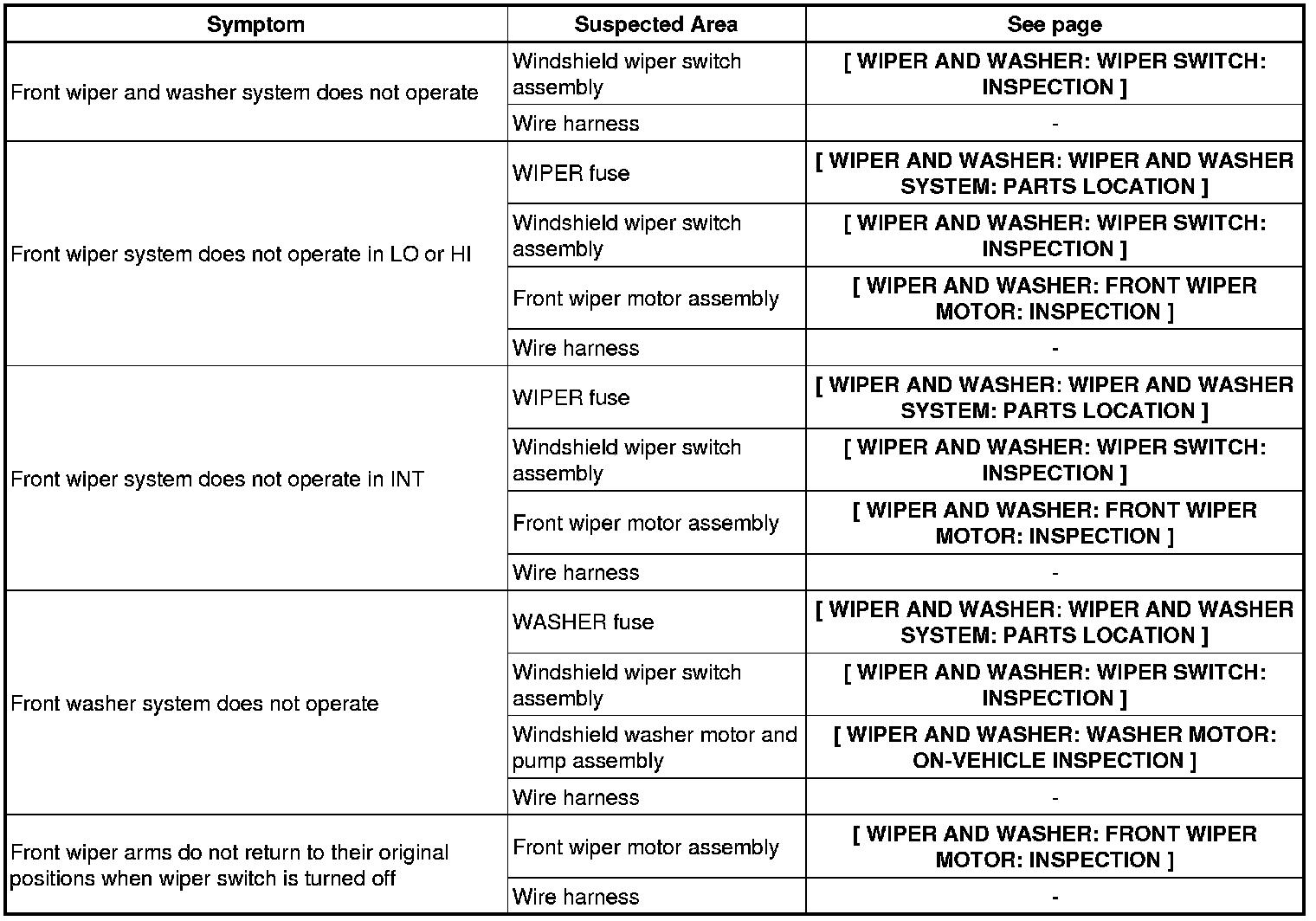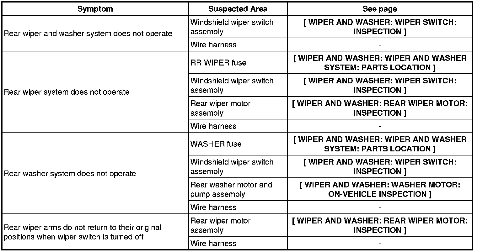 WIPER AND WASHER: WIPER AND WASHER SYSTEM: PROBLEM SYMPTOMS TABLE