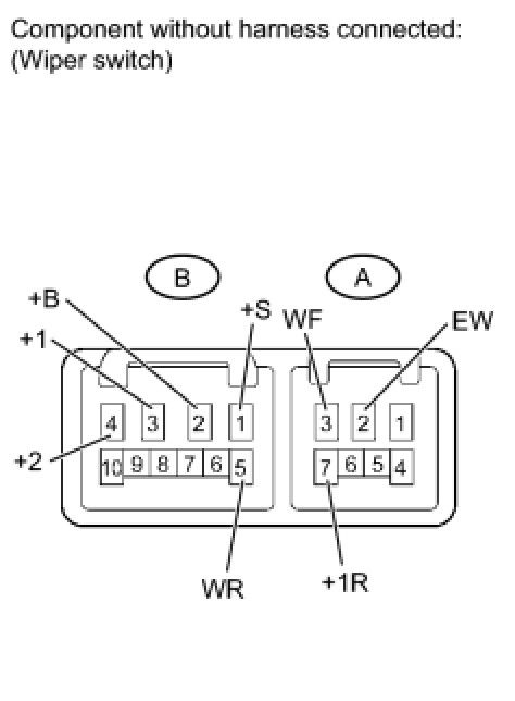 (5) Connect the negative (-) battery lead to terminal 1 (+S) of the B connector. Operate the intermittent wiper relay and check the voltage between terminals 3 (+1) of the B connector and 2 (EW) of the A connector.