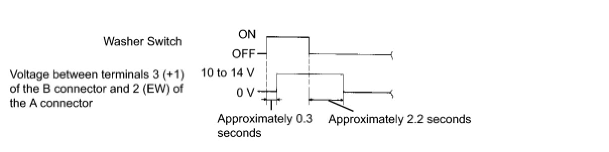 (3) Connect the positive (+) voltmeter terminal to terminal 3 (+1) of the B connector and the negative (-) voltmeter terminal to terminal 2 (EW) of the A connector. Turn the washer switch on and off, and check the voltage between terminals 3 (+1) of the B connector and 2 (EW) of the A connector.