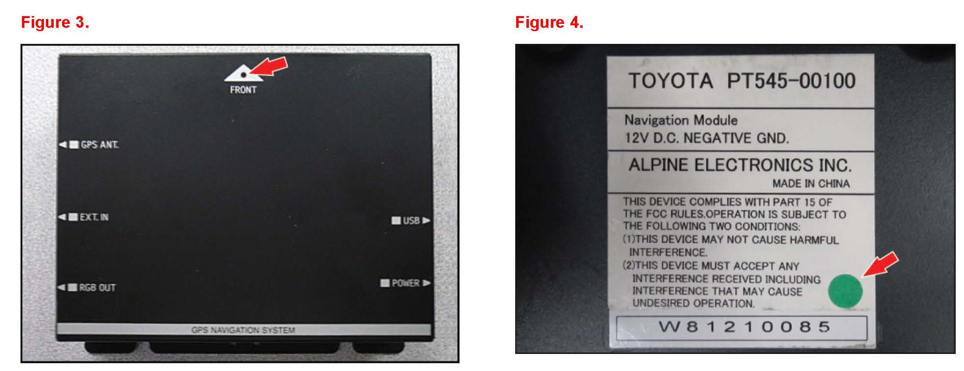 All countermeasured units which do not need to be updated will have a black dot in the white triangles located on the navigation module chassis (see diagram) and a green dot applied to the PIN label on the bottom of the module (see PIN label example).
