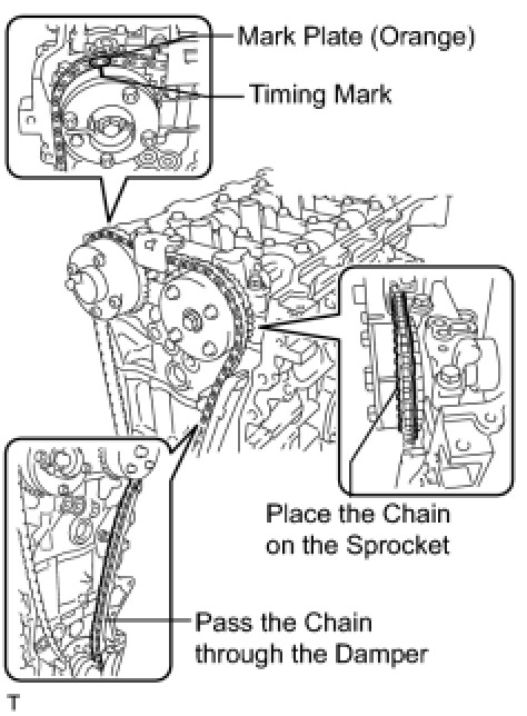 Align the mark plate (orange) with the timing mark as shown in the illustration and install the chain.