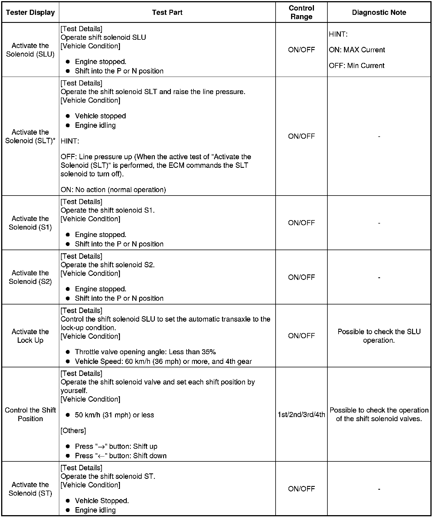 (g) *: Activate the Solenoid (SLT) in the Active Test is performed to check the line pressure changes by connecting the SST to the automatic transaxle, which is used in the HYDRAULIC TEST Hydraulic Test as well.