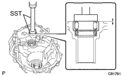 (b) Using SST and a press, install the front differential case rear tapered roller bearing (outer race) with plate washer onto the transmission case.