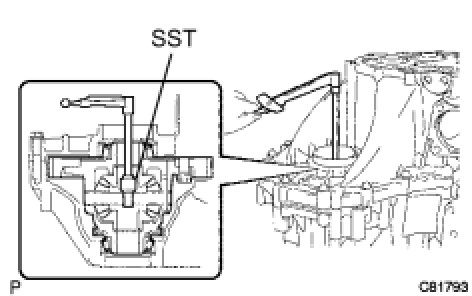 (a) Using SST and a hammer, install the shift and select lever shaft slide ball bearing onto the transmission case.