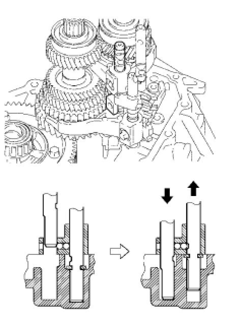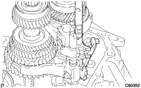 To avoid interference by the 2 shift fork balls, lift up the No. 3 gear shift fork shaft to the position shown in the illustration.