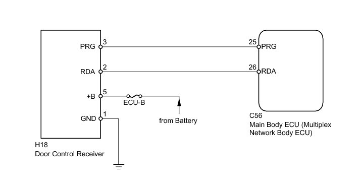 The door control receiver receives signals from the transmitter and sends these signals to the main body ECU (multiplex network body ECU). The main body ECU (multiplex network body ECU) then controls all the doors by sending lock/unlock signals to each door.