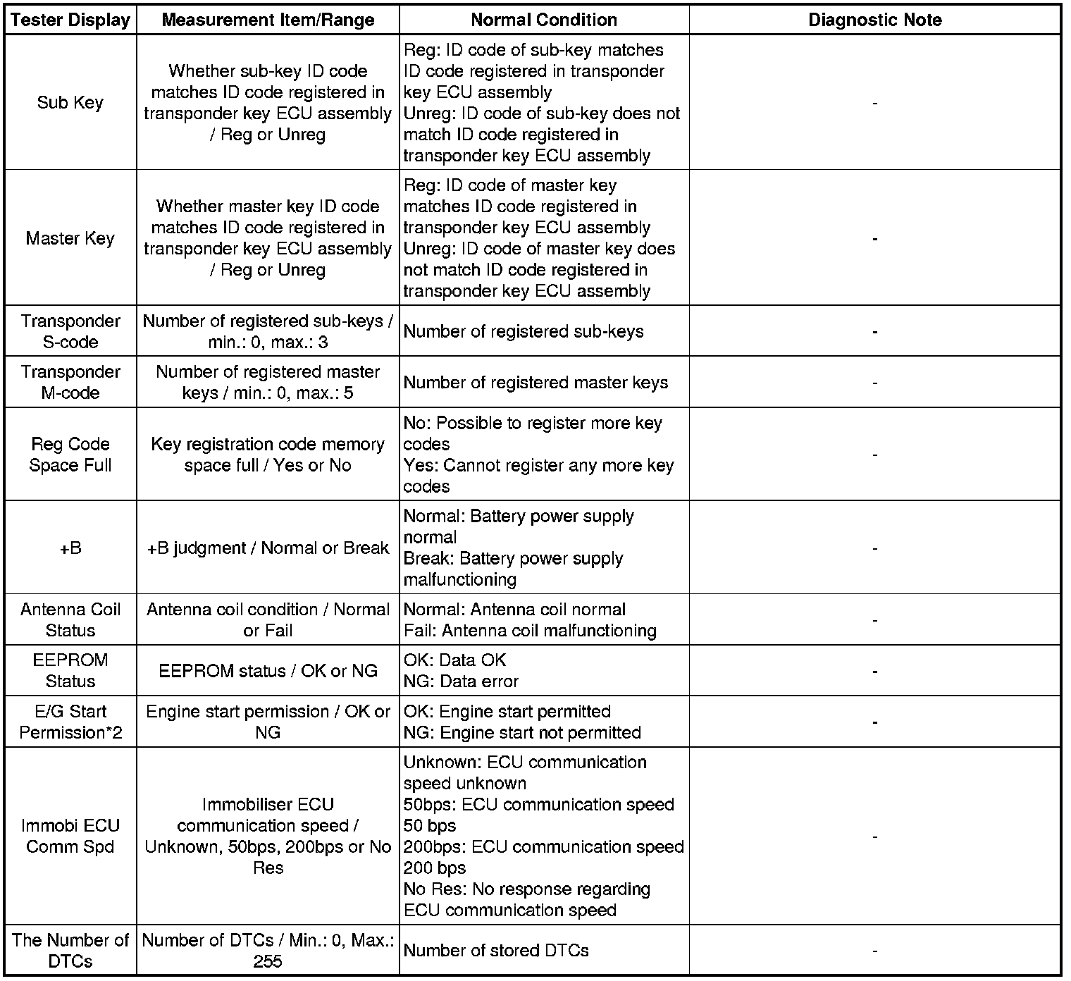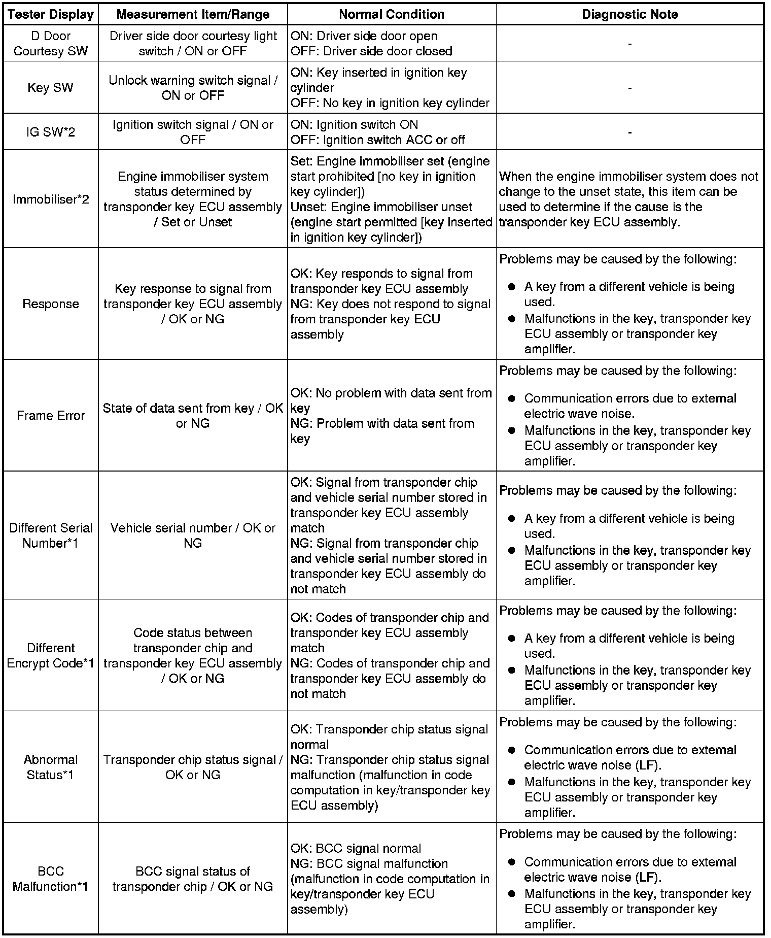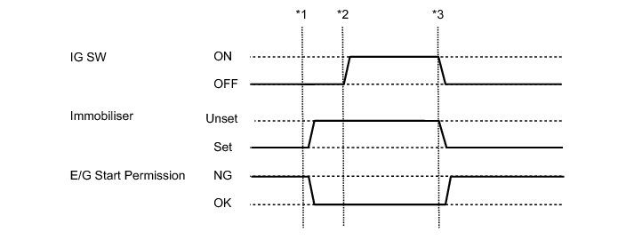 * *1: This indicates that there is a problem with the communication format between the key and transponder key ECU assembly. Electric wave interference, key or transponder key ECU assembly malfunctions, the key of another vehicle being used, etc. are possible causes.