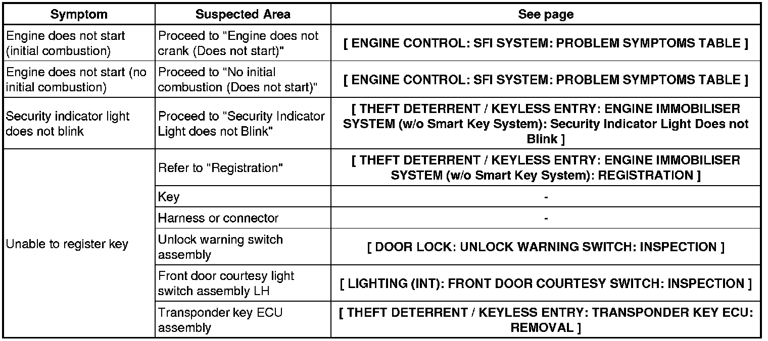 THEFT DETERRENT / KEYLESS ENTRY: ENGINE IMMOBILISER SYSTEM (w/o Smart Key System): PROBLEM SYMPTOMS TABLE