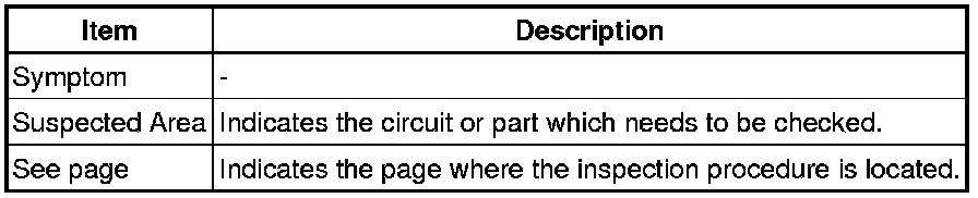 When no DTC is output but the problem still occurs, use the Problem Symptoms Table. The suspected areas (circuits or parts) for each problem symptom are shown in the table. The suspected areas are listed in order of probability. A description of each of the table columns is shown in the following table.