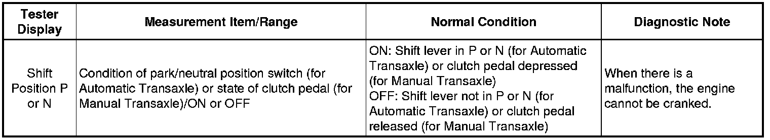 B -- READ VALUE USING TECHSTREAM (SHIFT P SIGNAL, NEUTRAL SW/ CLUTCH SW, SHIFT POSITION P OR N)