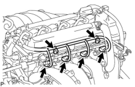 (c) Install the fuel delivery pipe together with the 4 fuel injectors, then temporarily tighten the 2 bolts.