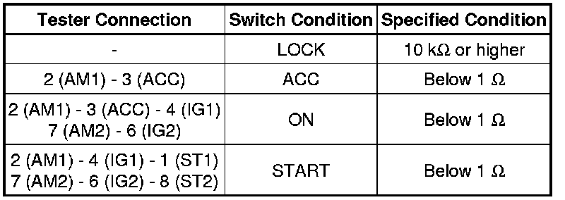 If the result is not as specified, replace the ignition switch assembly.