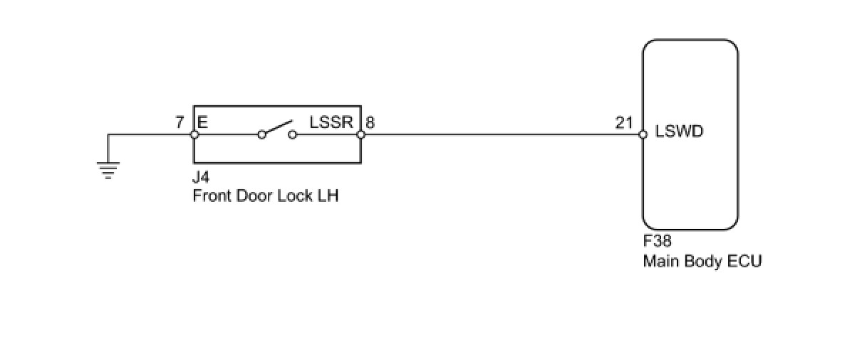 The driver side door unlock detection switch is built into the front driver's door lock. The switch turns on when the driver's door is unlocked and turns off when the door is locked. The main body ECU is connected to the front driver's door lock via terminal LSWD and driver's door lock/unlock state signals are input to the main body ECU. The main body ECU applies voltage to the door unlock detection switch via terminal LSWD. When the door unlock detection switch is off (there is continuity between the switch terminals), a lock state signal is input to the main body ECU. When the switch is on (there is no continuity between the switch terminals), an unlock state signal is input.
