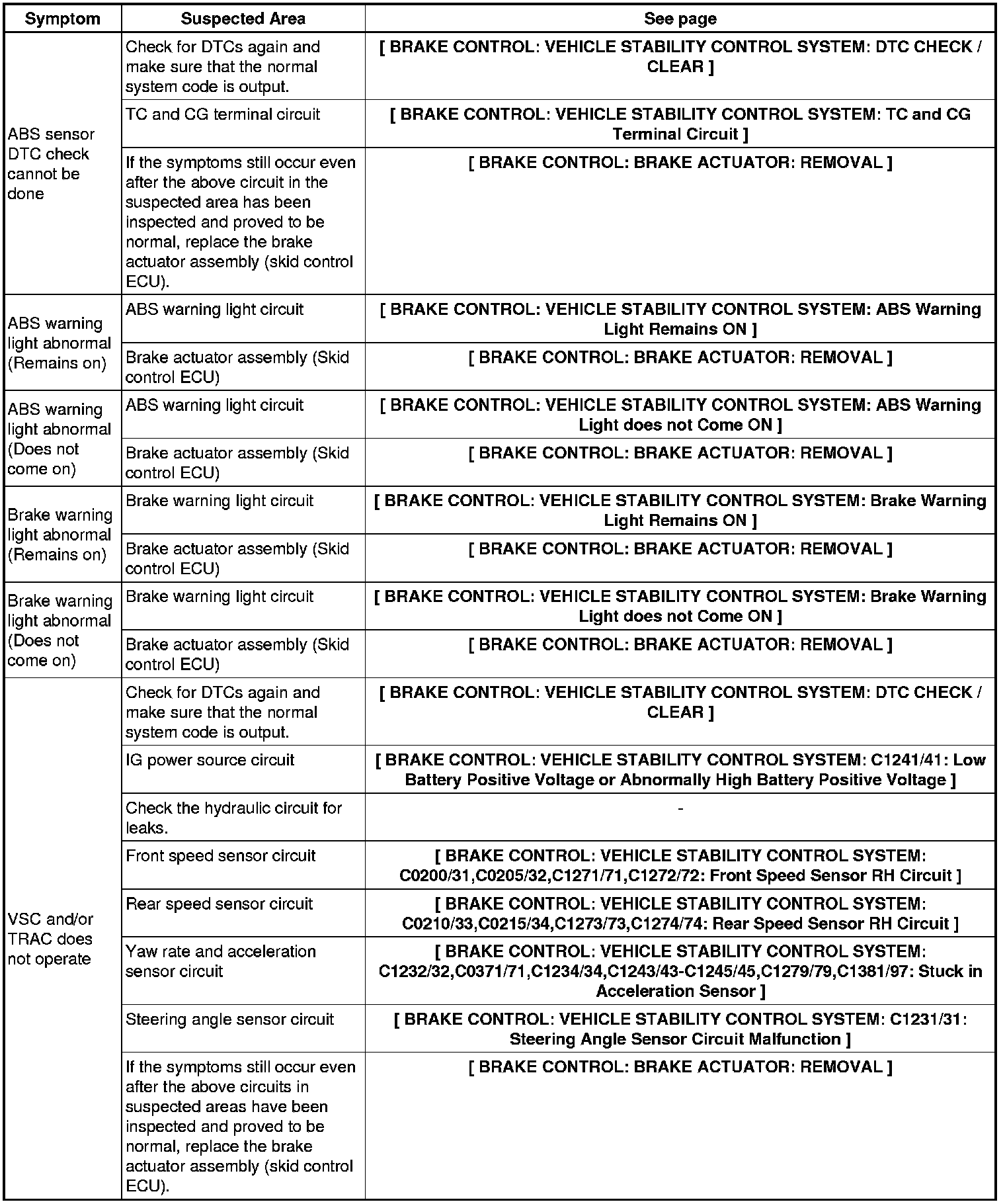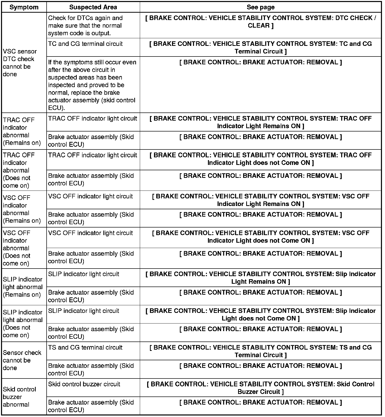 BRAKE CONTROL: VEHICLE STABILITY CONTROL SYSTEM: PROBLEM SYMPTOMS TABLE