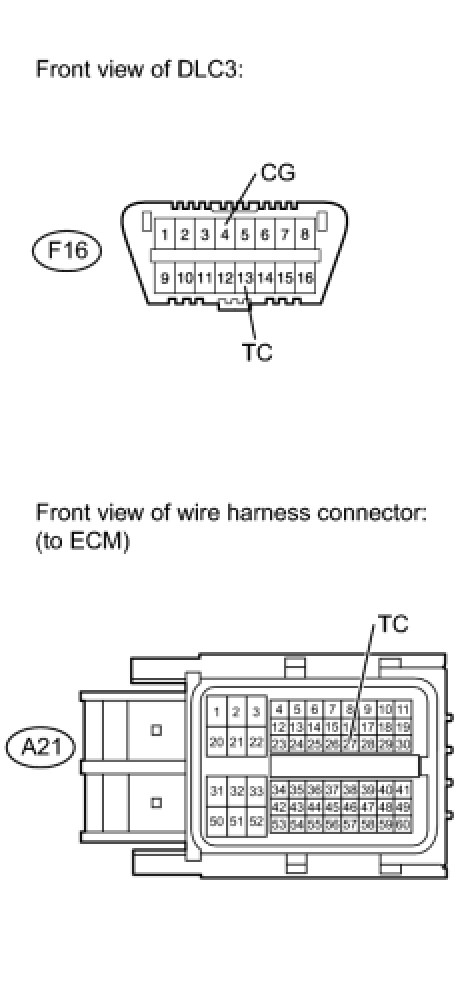 Connecting terminals TC and CG of the DLC3 causes the system to enter self-diagnostic mode. If a malfunction is present, DTCs will be output.