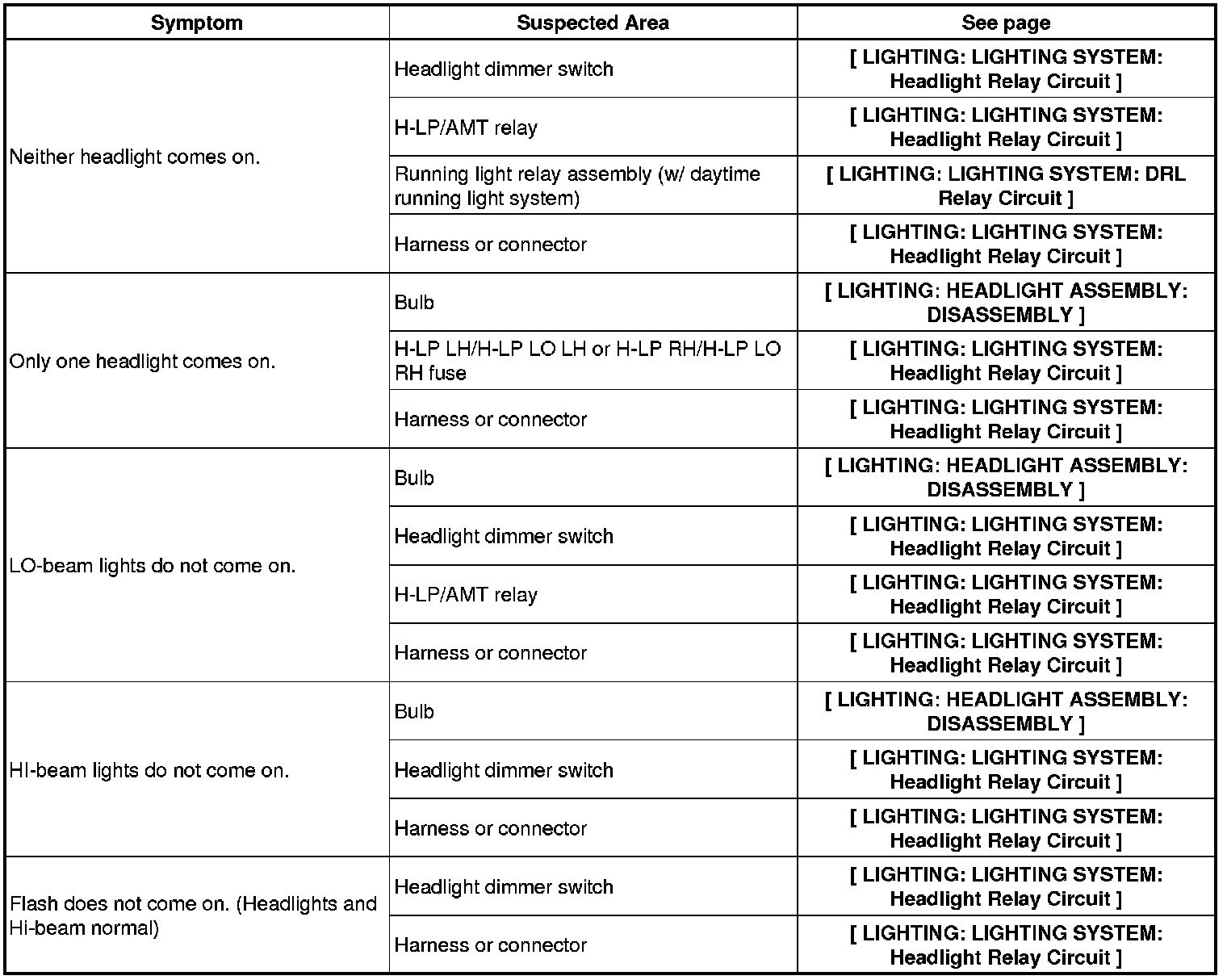 LIGHTING: LIGHTING SYSTEM: PROBLEM SYMPTOMS TABLE
