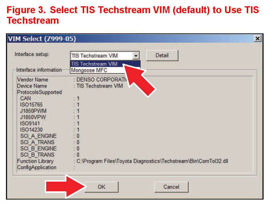 Techstream software requires a VIM selection before you can use the Mongoose MFC VIM. If using TIS Techstream no changes are needed.
