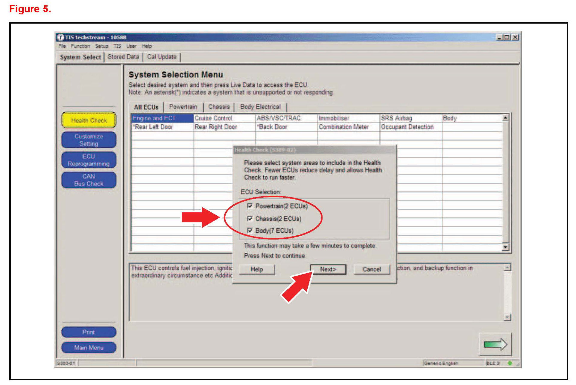 C. Choose desired ECU group(s) in the Health Check dialog box.