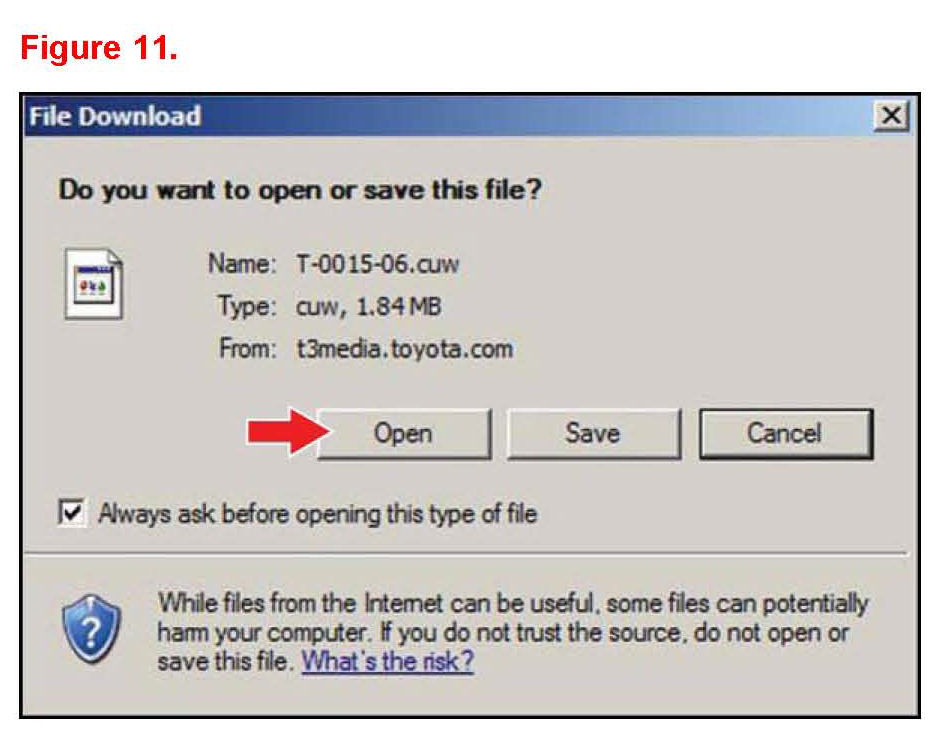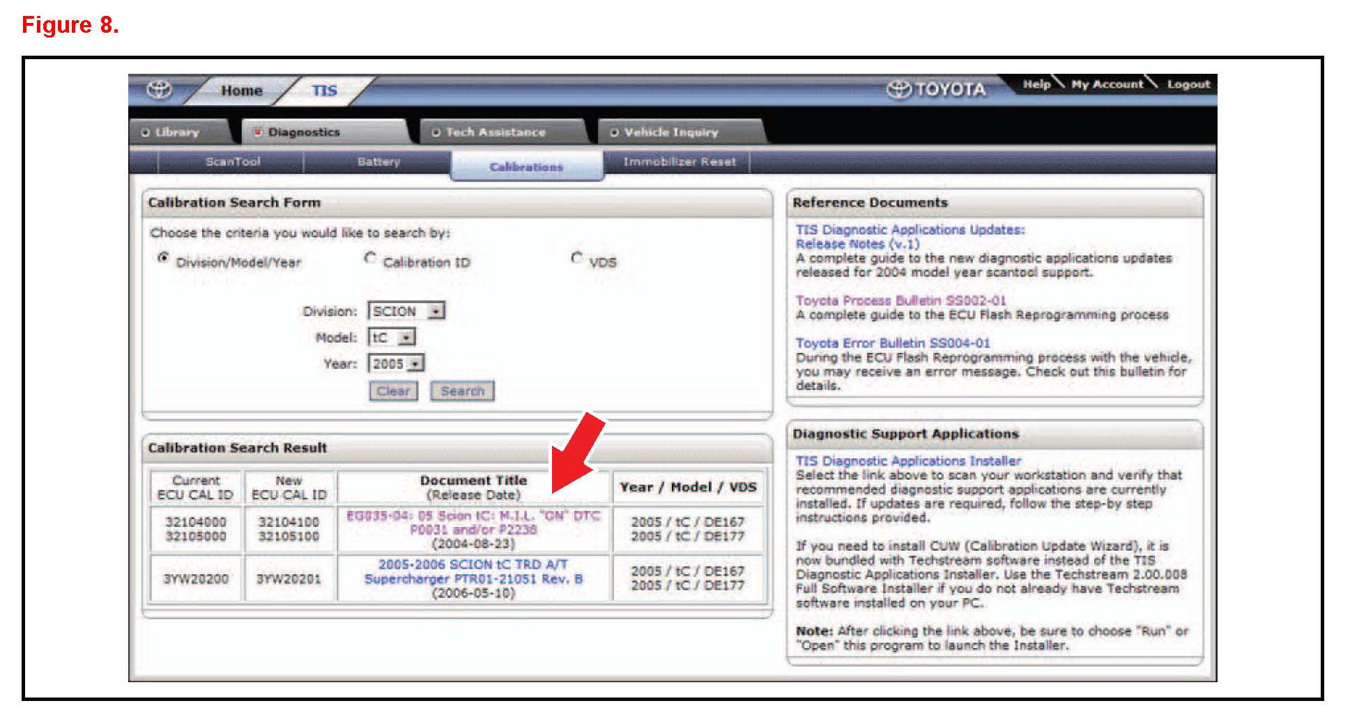 Techstream will automatically search TIS for the appropriate service bulletin using the current Calibration ID from the vehicle. Calibration file links can be found embedded in the corresponding service bulletin.