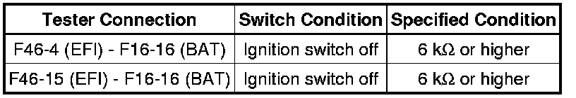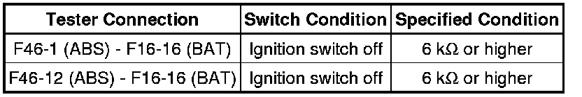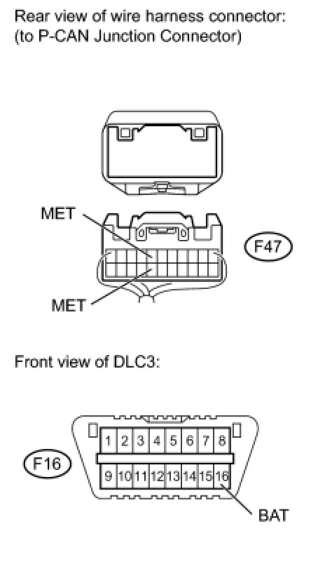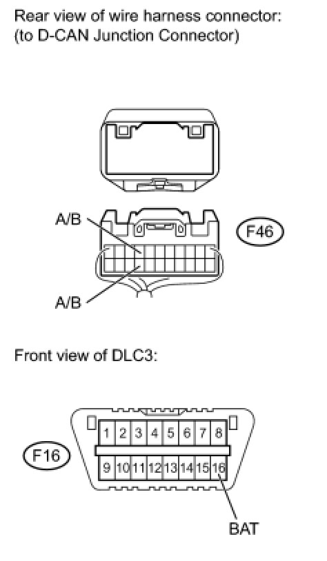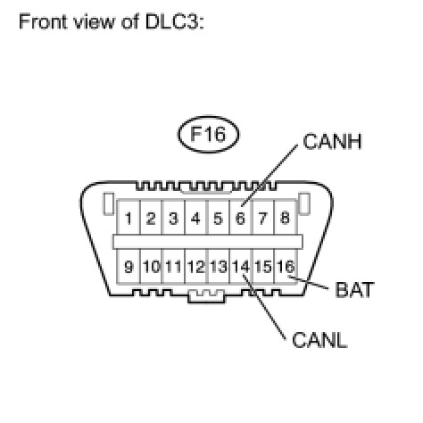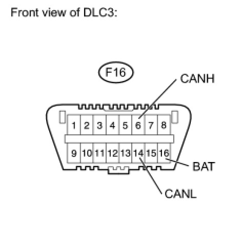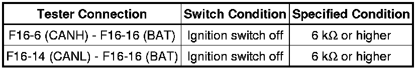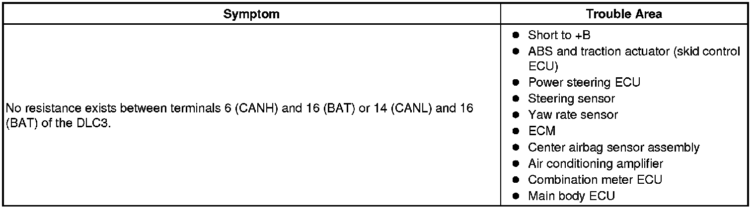 There may be a short circuit between the CAN bus line and +B when no resistance exists between terminals 6 (CANH) and 16 (BAT) or terminals 14 (CANL) and 16 (BAT) of the DLC3.