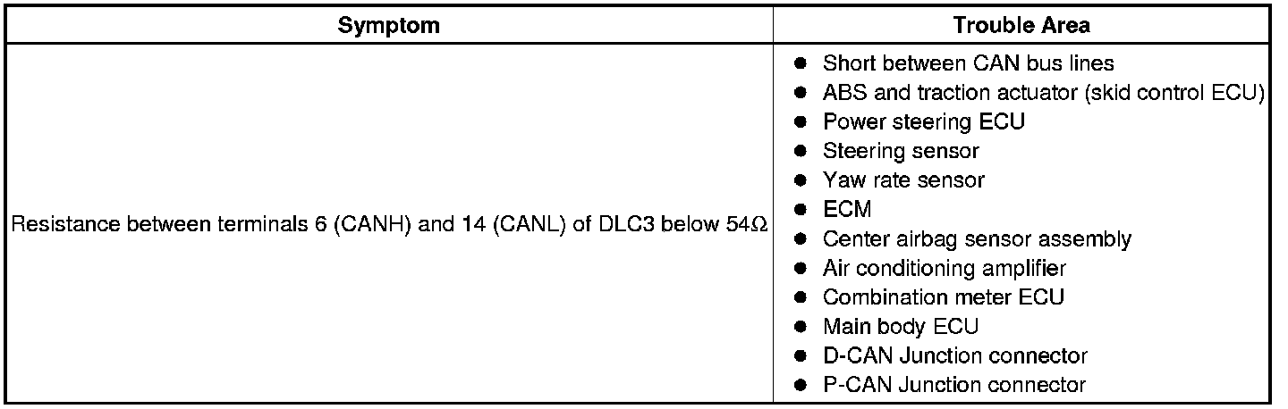 There may a short circuit in the CAN main wire and/or CAN branch wire when the resistance between terminals 6 (CANH) and 14 (CANL) of the DLC3 is below 54 Ohms.