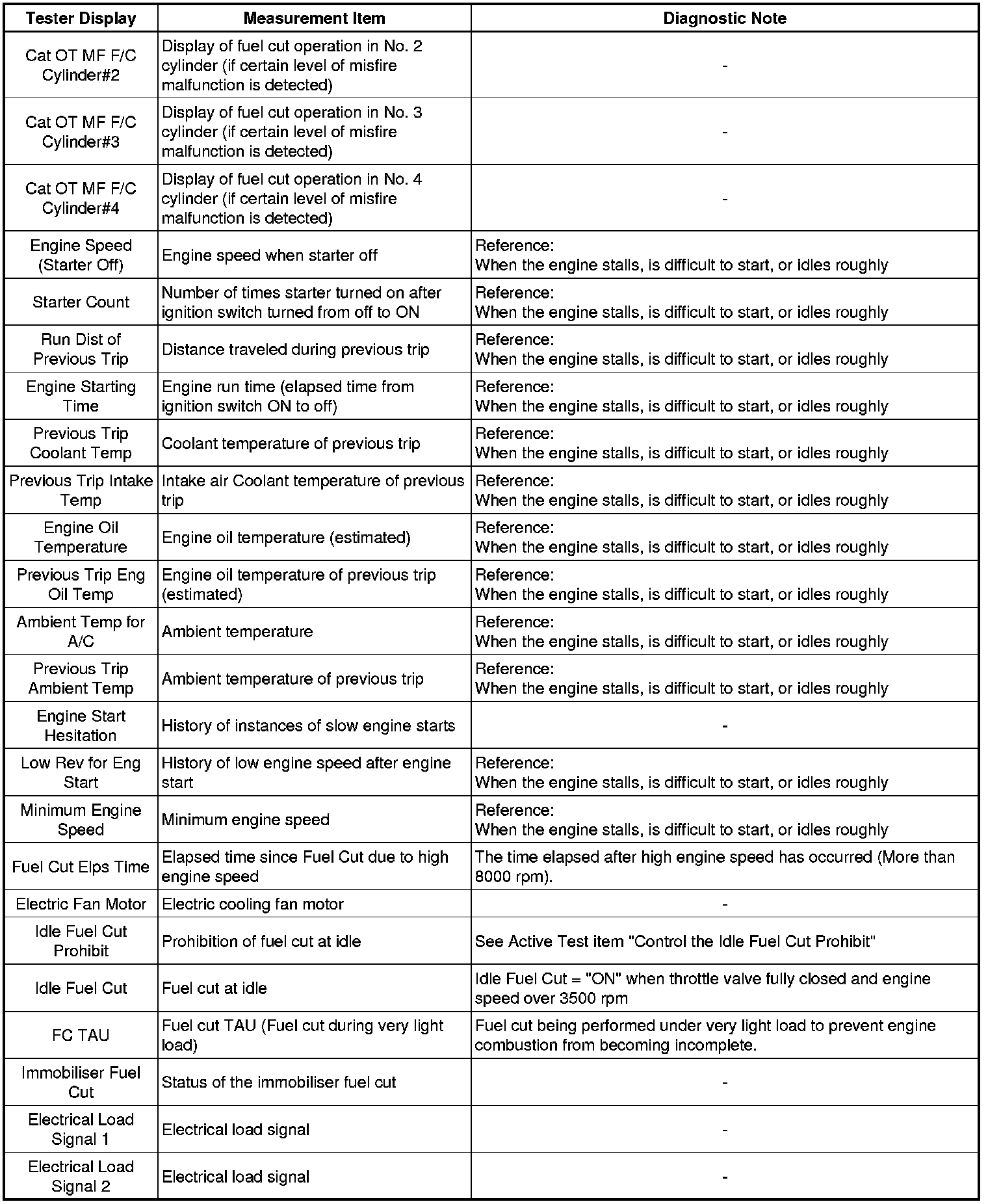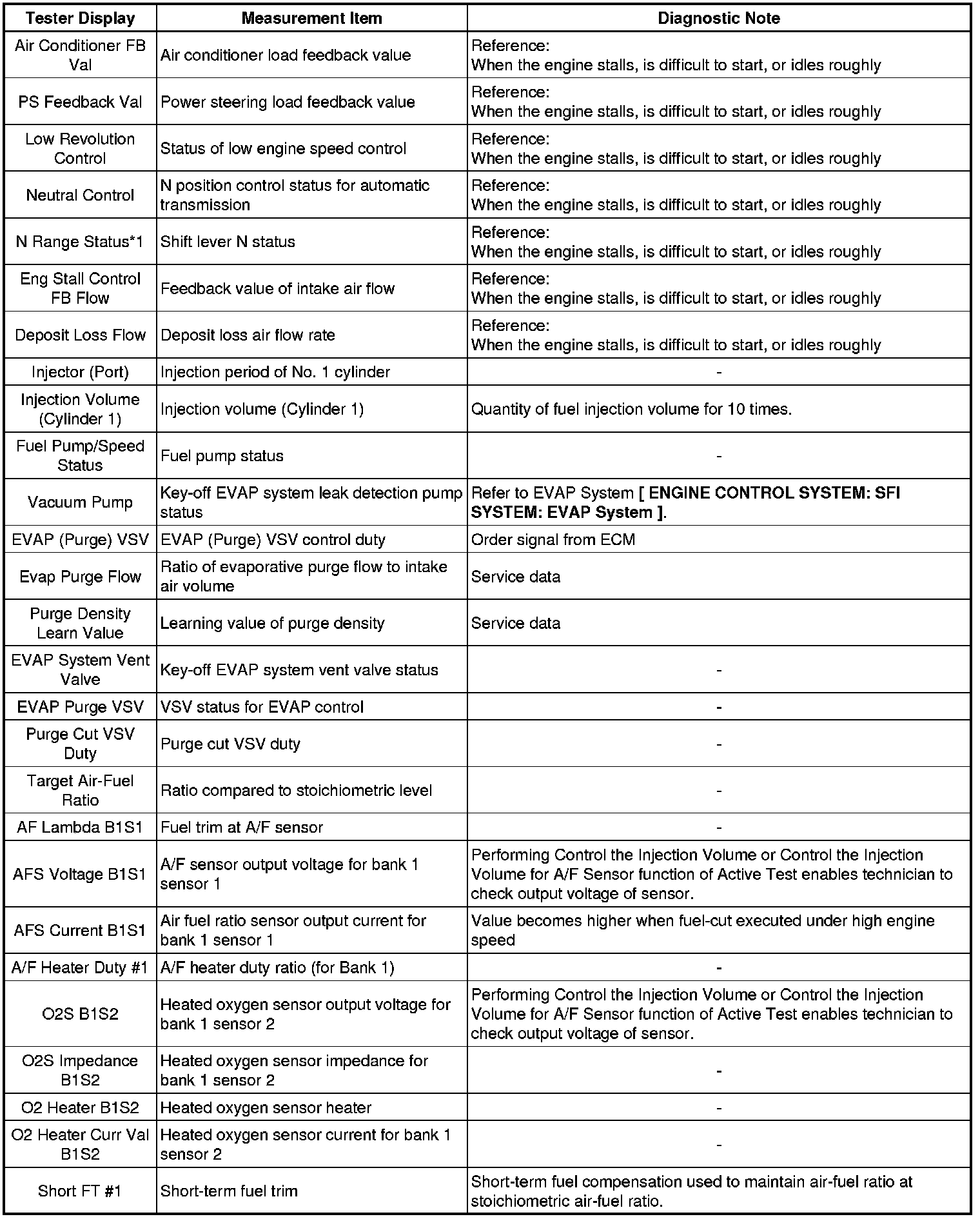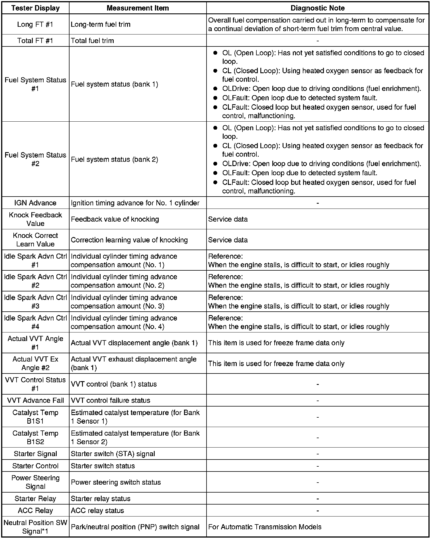 * The ECM records vehicle and driving condition information as freeze frame data the moment a DTC is stored. When troubleshooting, freeze frame data can be helpful in determining whether the vehicle was moving or stationary, whether the engine was warmed up or not, whether the air-fuel ratio was lean or rich, as well as other data recorded at the time of a malfunction.