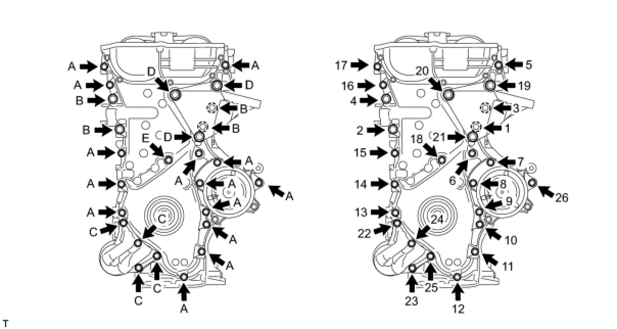 TIMING CHAIN OR BELT COVER SUB-ASSEMBLYInstall the timing chain cover with the 19 bolts as shown in the illustration.