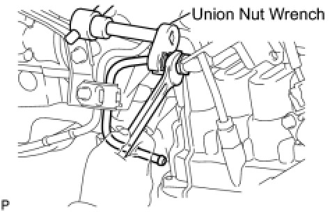(a) Using union nut wrench, separate the outlet No. 1 oil cooler tube while holding the oil cooler tube union with a spanner.