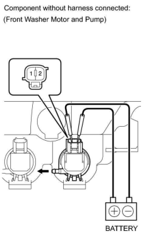 (2) Connect the positive (+) battery lead to terminal 2 of the front washer motor and pump assembly, and the negative (-) battery lead to terminal 1. Check that washer fluid flows from the washer jar assembly.