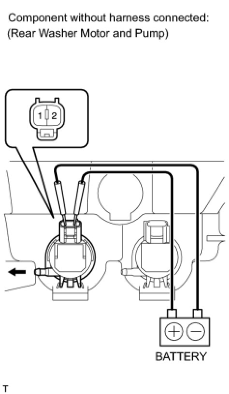 (2) Connect the positive (+) battery lead to terminal 2 of the rear washer motor and pump assembly, and the negative (-) battery lead to terminal 1. Check that washer fluid flows from the washer jar assembly.