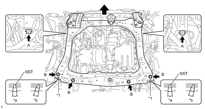 (c) By inserting SST into the datum holes in the front frame assembly RH and LH alternately, tighten bolts A and B on both sides to the specified torque, in several steps.