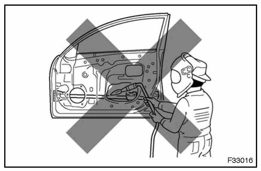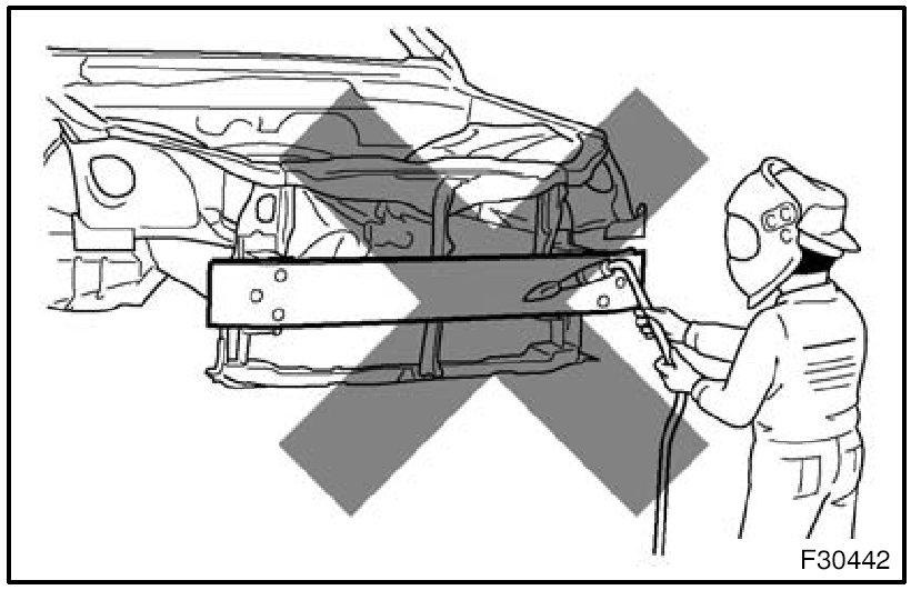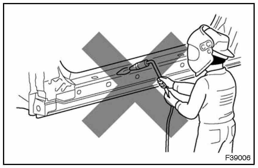 1. Rustproof high strength steel sheets are used for the body frame. Therefore, if these parts are heat repaired using an acetylene torch or equivalent, the crystalline structure changes, causing the strength of the steel sheets to decrease. Also, the zinc coating which is used to protect the body from rust will be damaged. This causes the surface of the steel sheets to become oxidized, which reduces their ability to resist rust.