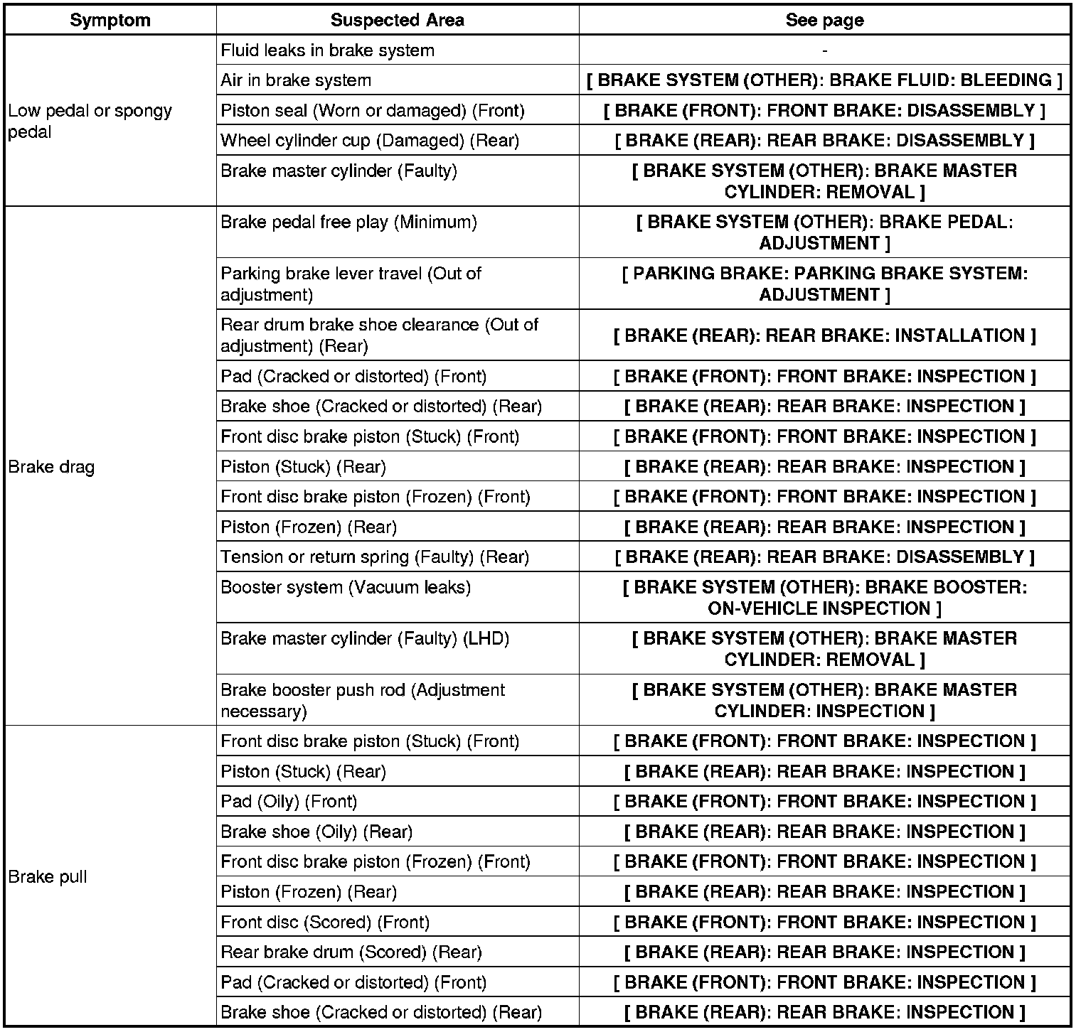 BRAKE SYSTEM (OTHER): BRAKE SYSTEM: PROBLEM SYMPTOMS TABLE