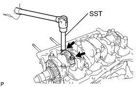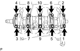 (a) Uniformly loosen and remove the 10 main bearing cap bolts in the sequence shown in the illustration.