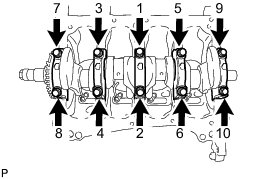 (1) Install and uniformly tighten the 10 main bearing cap bolts in the sequence shown in the illustration.
