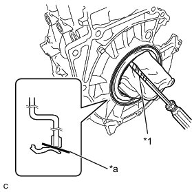 (b) Using a screwdriver with its tip wrapped with protective tape, pry out the rear engine oil seal.