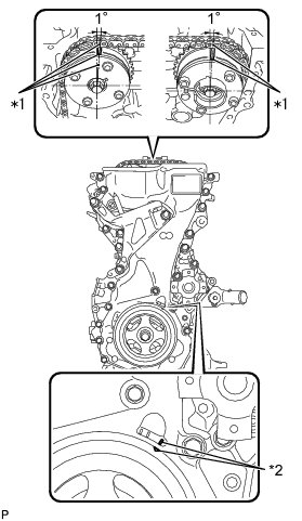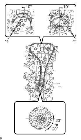 (b) Check that each timing mark of the camshaft timing gear and sprocket are located as shown in the illustration. If not, turn the crankshaft 1 revolution (360°) to align the timing marks as shown in the illustration.