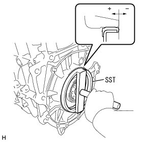(d) Using SST and a hammer, tap in the rear engine oil seal until its surface is flush with the cylinder block and oil pan.