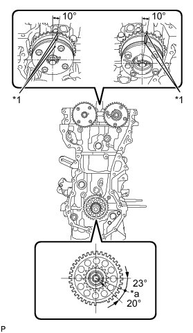 (b) Set the camshaft timing gear and camshaft timing exhaust gear in the positions (20° ATDC) shown in the illustration.