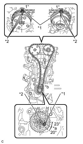 (e) Turn the crankshaft approximately 20° counterclockwise to set it to TDC. Make sure that the timing marks and mark plates are correctly positioned and that the chain is securely fit into the tension arm, guide and vibration damper.