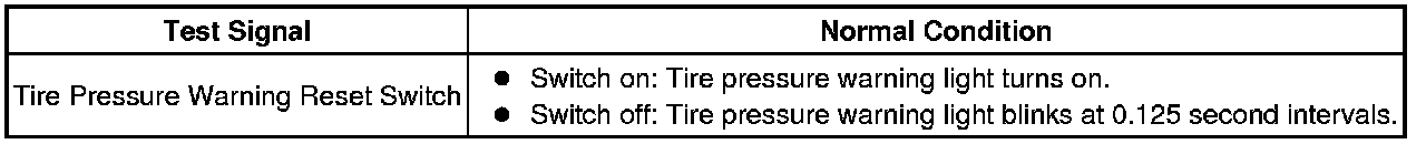 * During test mode (signal check mode), the system is not initialized by pushing the tire pressure warning reset switch. The circuit of the tire pressure warning reset switch can be inspected during this mode.