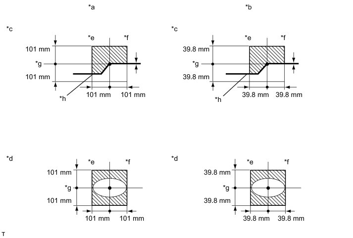 * If the alignment distance is 3 m (9.84 ft.): The high beam center of intensity should be within 39.8 mm (1.57 in.) above or below the H line as well as 39.8 mm (1.57 in.) left or right of the V line.