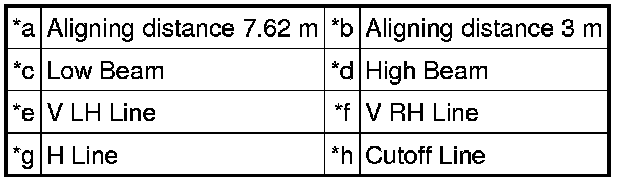 * If the alignment distance is 7.62 m (25 ft.): The low beam cutoff line should be within 101 mm (3.98 in.) above or below the H line as well as 101 mm (3.98 in.) left or right of the V line.